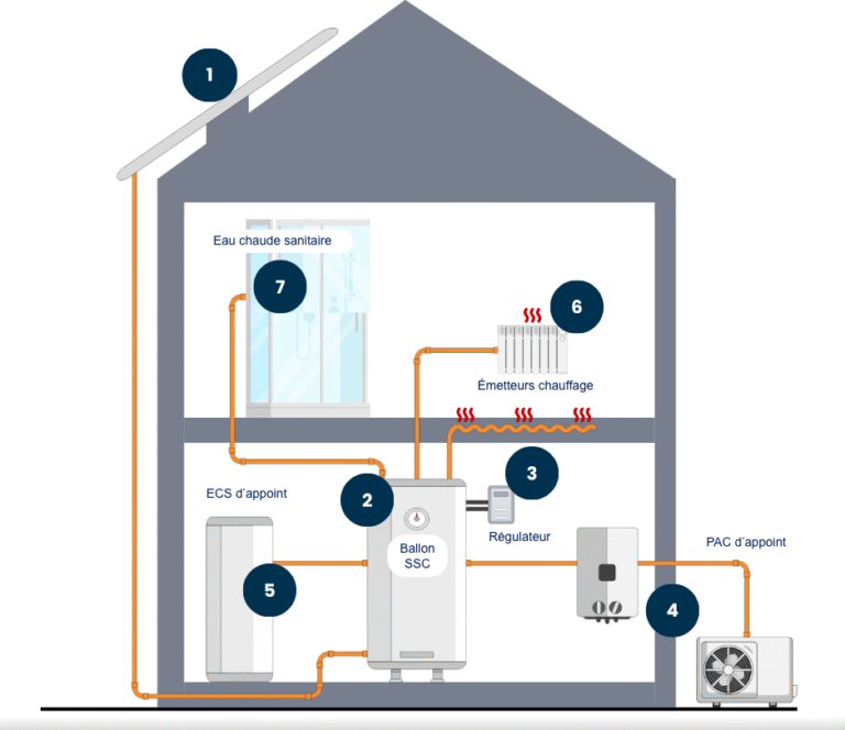 En pratique, un SSC couvre rarement 100 % des besoins, surtout en hiver. Il est dimensionné pour apporter une part importante de chaleur gratuite sur l’année (mi-saison, intersaison, eau chaude sanitaire), tandis qu’un système d’appoint (chaudière, PAC, poêle…) prend le relais en période froide ou lors des pics de consommation. L’objectif est de réduire fortement la facture, pas de se passer totalement de l’appoint.